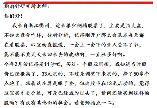 来信收到,研究所老师已经详细阅读了你信中的内容,炒股经历字字恳切,相信大家也和你一样都有这相似的经历,您来信可谓是开门见山啊,对股市的感受直言不讳,不过,在一只股票上赚到钱,是我们共同的愿望,股市的最大魅力在于能给投资者带来阶段收益,成本低,便于操作,不耽误时间,尤其是当我们知道了股价的运行趋势后,就不用天天盯着看了,下面就你信中所关心大盘和个股亚玛顿做一分析,在这里和你做个详细的分析,也和大家一起共勉。
