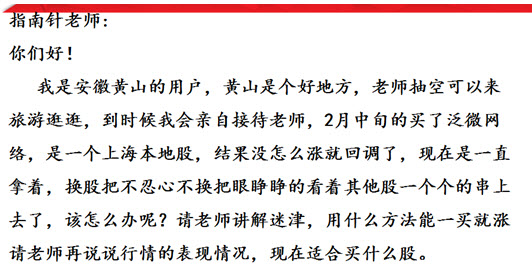 来信收到,研究所老师已经详细阅读了你信中的内容,你主要诉说的问题是买了股票后就没见怎么涨,这与我们平时的操作习惯的分不开的,有的人喜欢抄底,当往往抄在半山腰,有的人喜欢追高,往往追在山顶上,出现这些情况,是可以理解的,我们来到股市就是为了多多获取利润的,只要你掌握了方法,学会了技巧,也一样能和其他用户赚到钱,再就是目前行情的情况,也是多数人比较关心的,今天回信也一并解答,至于您提到的买什么股能赚大钱的事情,老师是不能在具体谈某只个股的情况的,在这里请您谅解,可以给大家画画板块重点,已经短期中期的一些热点方向,是可以的,但这些都是基于软件的数据,如资金的流入啊,开仓信号啊等等。下面就你所说的问题,我们在这里一一作出解答,同时也可广大投资者朋友一同共勉。