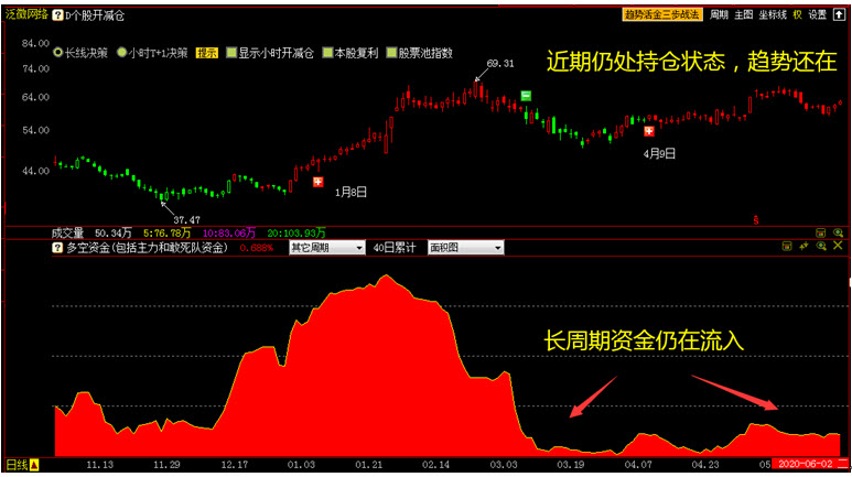 这位用户买入的时间点位正好在第一波上涨行情的开仓阶段,属于追高了,而在闭仓阶段,又没有果断卖出,所以一路折腾,不过现在又处于持仓阶段,同时结合下方资金来看,长周期资金仍然在红彤彤的流入,因此,一是在开仓条件下,目前新的上涨趋势还没结束,二是资金还在流入,虽然流入的不像此前那么猛烈,但至少说明一点,就是主力还在看好这个股,所以按照信号来看,目前没有出仓的必要,等待趋势出现减仓信号和资金流出的时候,再获利了结也不迟。