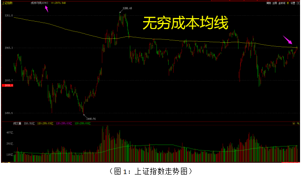 我们前面说了,上证大盘的走势是在无穷成本均线位置,无穷成本均线的技术含义是什么?是市场的平均成本,如果在无穷成本均线上方运行,意味着主力在获取的是市场的获利盘,敢于解放所有的筹码,是强势走势;如果在下方运行,市场交易的割肉盘,是弱势走势。所以,市场强弱分水岭的一个重要指标就是无穷成本均线。如果一旦向上打破无穷成本均线,主力的上攻意图就非常的明显了。如果在无穷成本均线下方震荡,主力有可能在折磨在解套附近徘徊的散户,通过长时间的震荡考验市场的耐心,获得筹码。