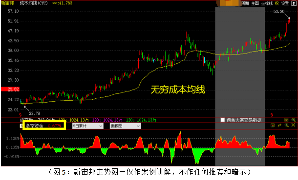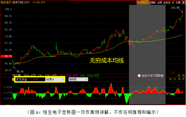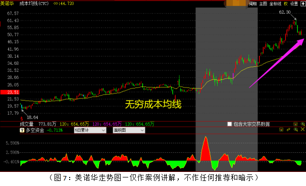 所以,看清主力资金在无穷成本均线的运作轨迹,抓住这条关键点,我们在选股的时候,就能抓到机会。我们把前面3只股票的无穷成本均线和多空资金流向数据叠加上。如图5、图6、图7: