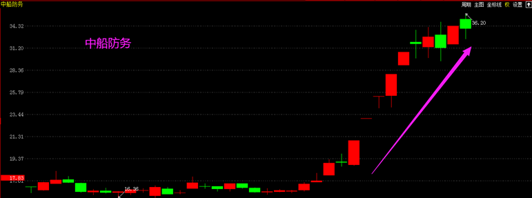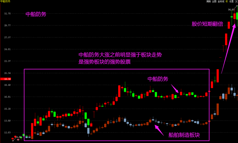选到板块再看个股,该板块中表现最好的股票就是中船防务,为什么呢?通过个股对比板块,我们发现他就板块中走势最强的股票,它就是强势板块的强势股票。