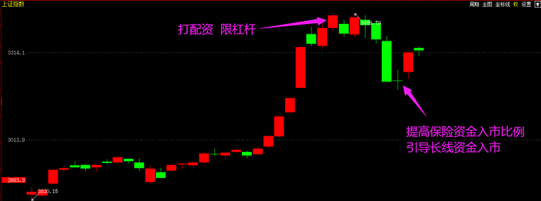 从行情来看,下一步会怎么走?首先我们要深刻了解政策意图,当大盘从3000点快速上涨到3400,管理层打配资,去杠杆,控制大盘节奏,而在市场回落之后,管理层又放宽保险资金入市比例,引导长线资金入市,政策有保有压,一连串的动作可以看出维护市场健康向上的意图明显。