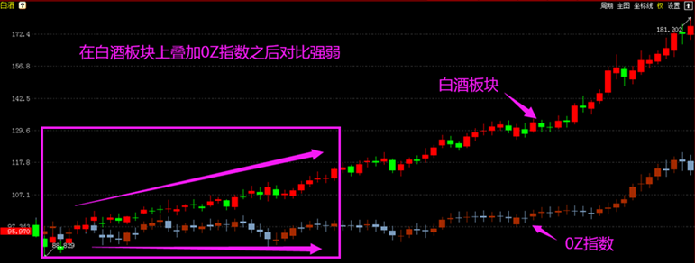当时我们在集训课程中,就是通过这个方法在行情大涨之前发现了白酒、光学光电子、医疗器械板块的机会。以白酒板块来说,怎么提前发现它是热点?在板块上叠加0Z指数(新涨跌指数),在4月份我们就发现它明显走强,见下图: