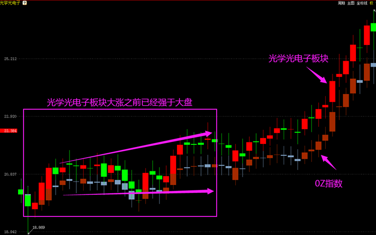 再用这个方法看当时的光学光电子板块,同样也是提前大盘走强,随后该板块大涨,见下图: