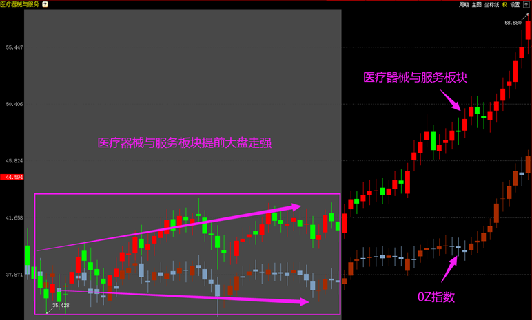 同样的方法,我们看医疗器械板块,大涨之前,就可以通过板块和大盘对比可以发现,该板块明显强于大盘,随后板块大涨30%,见下图: