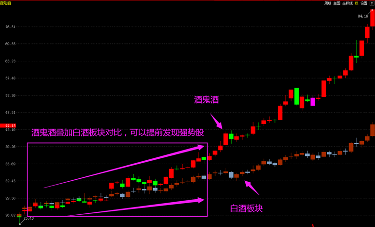 只需在个股上叠加板块指数,通过对比,找到强于板块的强势股票,比如我们看白酒板块中的酒鬼酒,通过对比可以发现,这是板块中的强势股票。