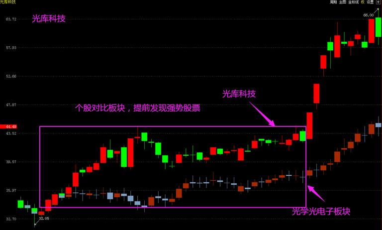 再看光学光电子板块中的光库科技,通过个股和板块对比,可以在它走强之前就发现强势股的机会。