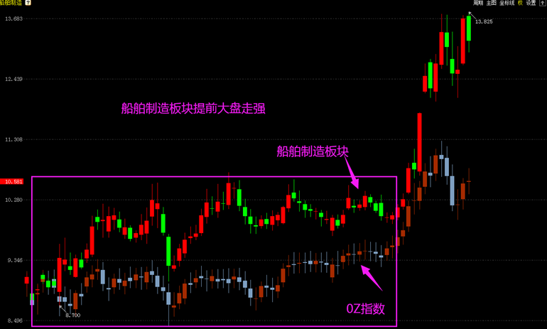 近期市场大涨的板块,我们看能不能通过这个方法提前发现呢?我们看大涨之前的船舶制造板块。底部横盘时已经强于0Z指数,是市场的强势板块。