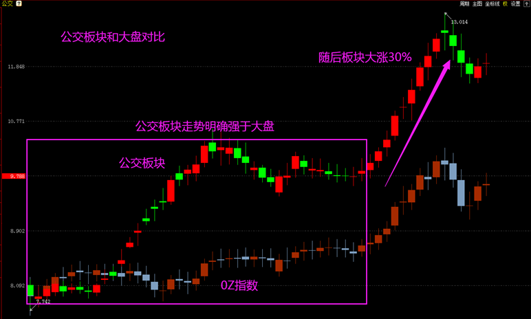 再看近期大涨的公交板块, 通过对比,可以提前确定强势板块,见下图