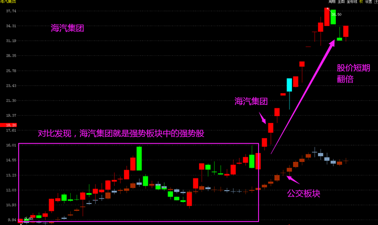 板块中个股谁提前走强?用个股对比板块,发现海汽集团就是板块中的强势股票。随后该股大涨翻倍。