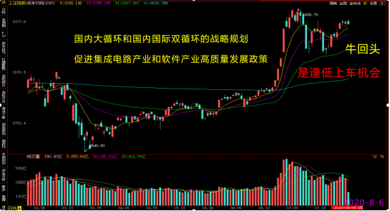上证指数在3400点后展开宽幅震荡,从近期盘面特征来看,每当大盘震荡向下时都会有强劲的买盘趁机低吸,反弹几天后又出现震荡调整,这种现象往往是震荡蓄势的表现。在政策方面:7月31日,中央召开高级别会议,并提出国内大循环和国内国际双循环的战略规划。紧接着8月4日,国务院印发了《新时期促进集成电路产业和软件产业高质量发展若干政策》。在短期内密集推出顶层战略设计规划,无疑给了投资者很大的信心,同时也指明了投资方向,一定要跟上步伐抓住机会。