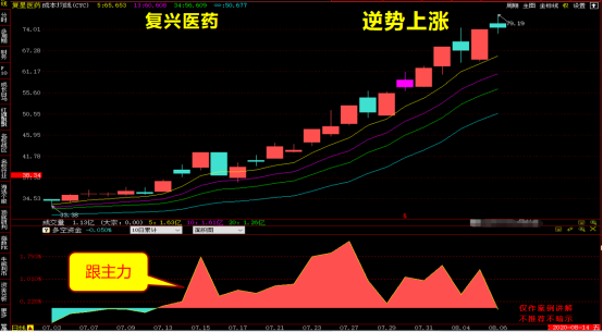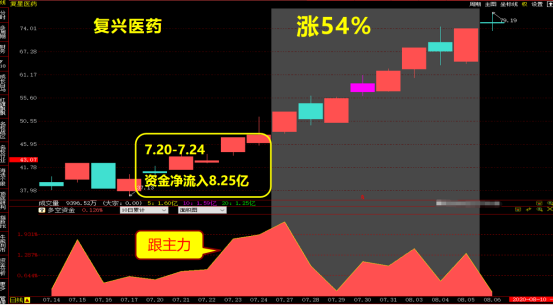 复兴医药这期间主力吸筹净买入8.25亿,后面上涨54%。看,跟主力抓到了牛股。所以说,通过两步跟主力选牛股这个选股方法是稳定的、靠谱的。