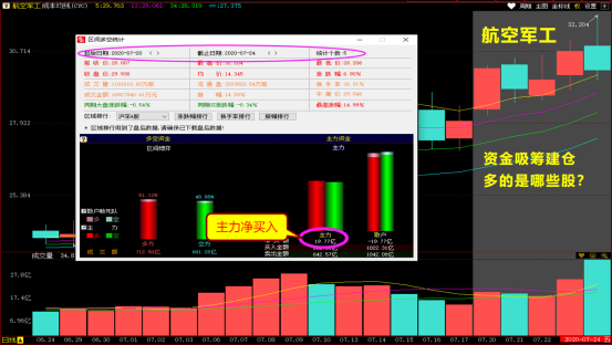 上图:经过板块数据统计发现航空军工板块有资金逆势吸筹。7月20日-7月24日期间主力吸筹建仓净买入19亿,这样就完成了第1步,找到了主力建仓多的板块。