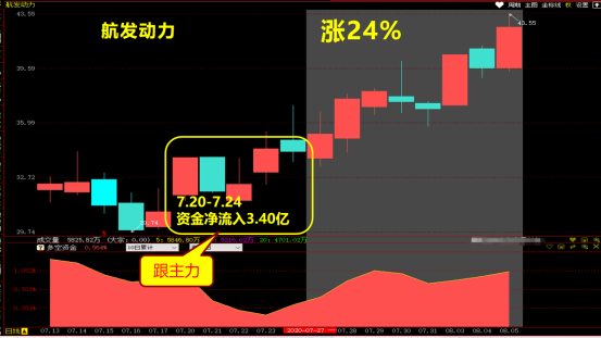 上图:航发动力这期间主力吸筹净买入3.4亿,这就解决了跟主力选股的问题,后面上涨24%。跟主力抓到了牛股!