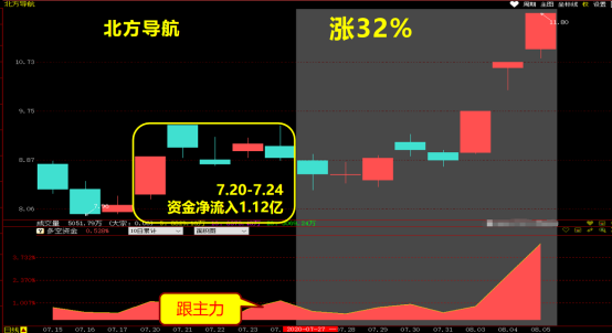 上图:北方导航这期间主力吸筹净买入1.12亿,后面上涨32%。