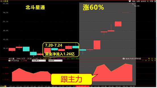 北斗星通这期间主力吸筹净买入1.26亿,后面上涨60%。跟主力抓到了牛股!通过这两步,就解决了跟主力选股的问题。