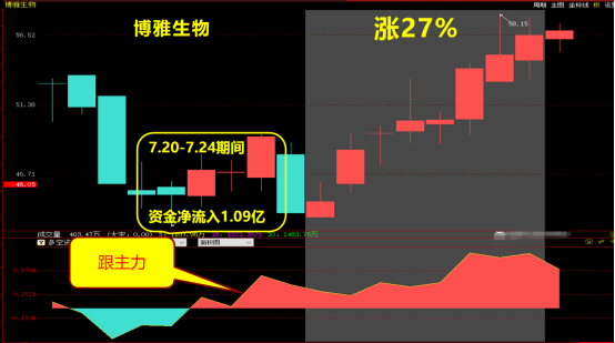 上图:博雅生物这期间主力吸筹净买入1.09亿,后面上涨27%。看,这样就抓到了牛股,就解决了跟主力选股的问题。