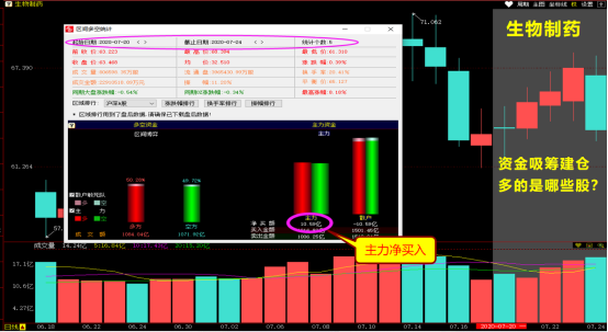 上图:第1步:翻找统计71个行业板块资金数据,发现证生物制药板块也有资金大举建仓。这期间一周内主力吸筹建仓净买入10亿。